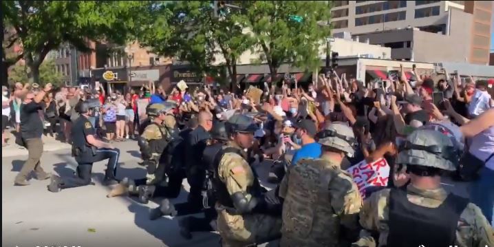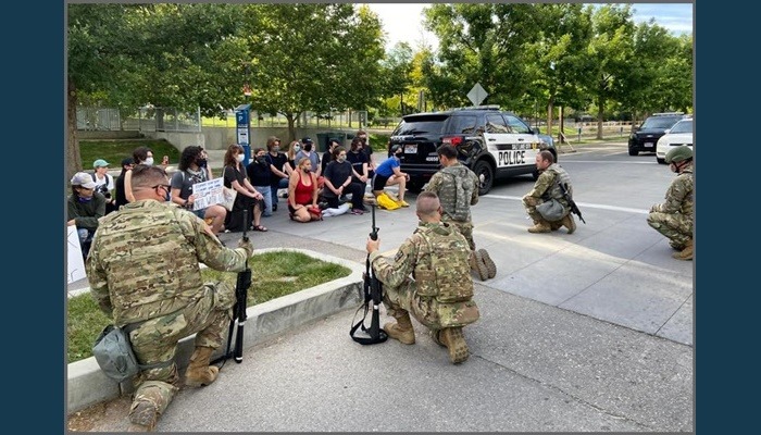 But that same scene photographed from a different angle shows a less than intimidating group of guardsmen on the steps, far outnumbered by the crowd of peaceful protesters who had gathered. The soldiers weren’t even armed or carrying defensive riot shields. Hardly alarming and therefore hardly newsworthy because it doesn’t outrage you then it’s not baiting you enough to click.